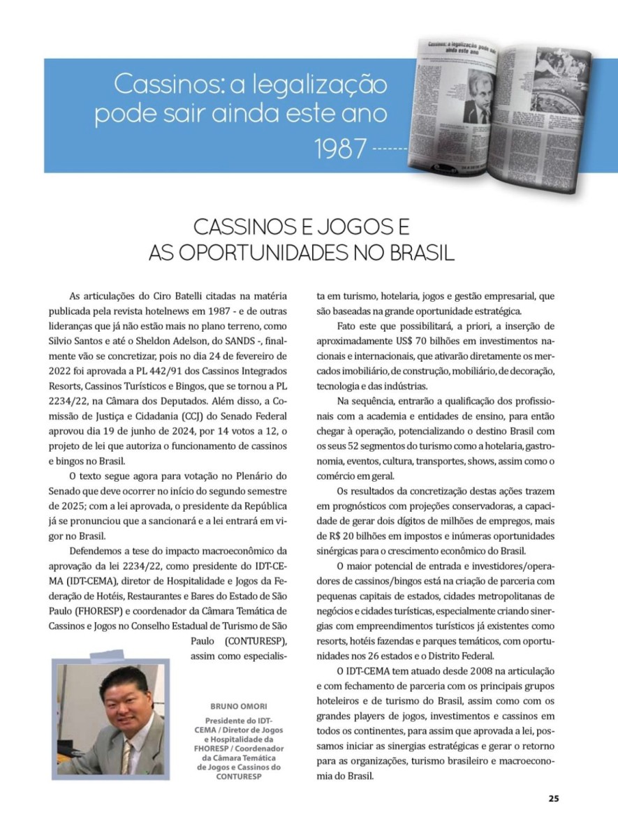 Matéria do Presidente Bruno Omori na Revista Hotel News "Cassinos e Jogos e Oportunidades no Brasil"